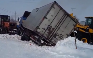 Из-за снега водитель грузовика не увидел края дороги