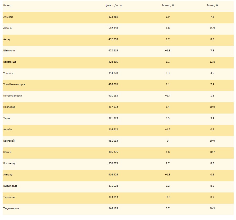 Снижение цен зафиксировано в Актобе (−2.6%) и Атырау (−0.8%).