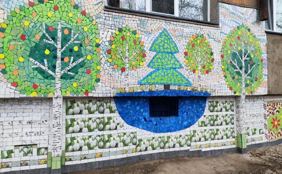 Грациозные кошки, мультяшные собачки, русалки, драконы и цветочные поляны — фасад одного из домов на улице Терешковой в Караганде с каждым годом становится всё ярче. Здесь появляются новые мозаичные картины, и у всей этой красоты один автор — Любовь Першукова. По собственной инициативе, в одиночку, она превращает серые стены в настоящую галерею под открытым небом.