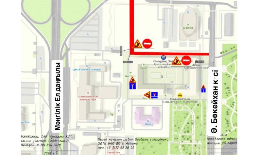 В рамках реализации проекта «Строительство улиц в районе пересечения проспекта Мәңгілік Ел и улицы Сыганак» с 26 апреля по 1 сентября текущего года будет полностью перекрыто движение между БЦ «Syganaq» и ЖК «Ишим», передает официальный сайт акимата Астаны.