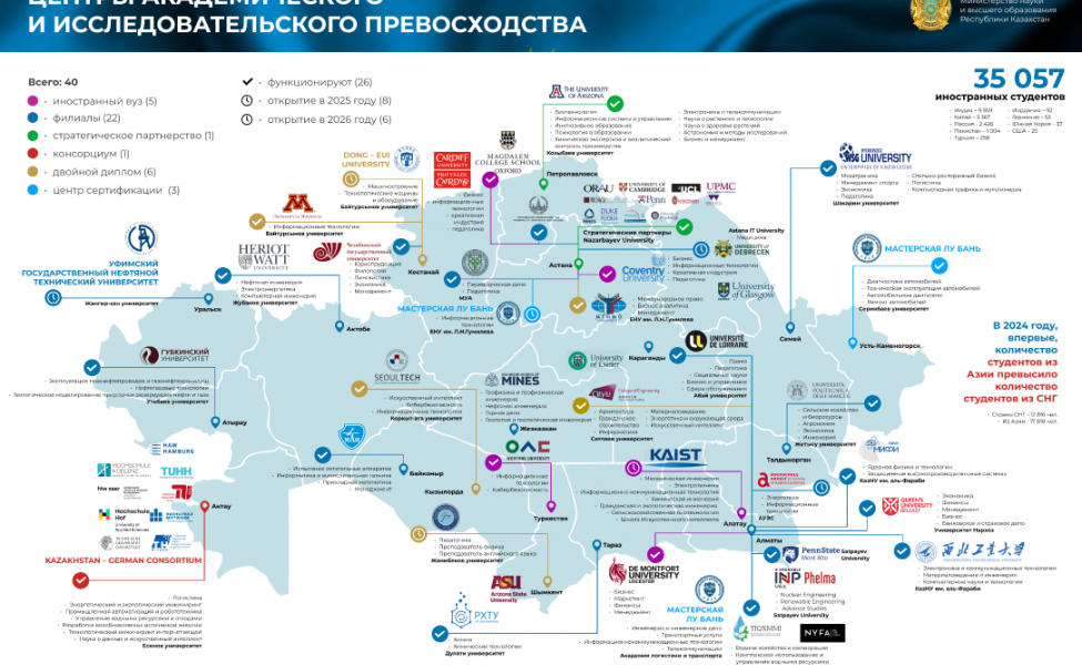 В Казахстане выстроено 40 стратегических партнерств с ведущими зарубежными университетами, включая 33 действующих филиала иностранных вузов. Эти шаги формируют прочную основу для подготовки конкурентоспособных кадров, развития науки и интеграции страны в мировое академическое сообщество.