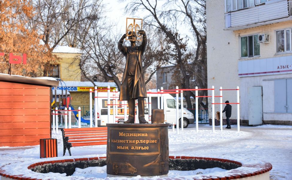 Памятник медицинским работникам представляет собой фигуру врача, стоящего на постаменте. В руках медик держит рентгеновский снимок легких человека, передает ru.sputnik.kz.