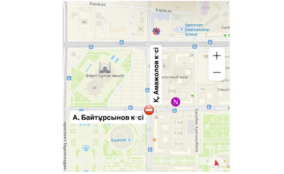 Движение на пересечении улиц А.Байтурсынова и К.Аманжолова полностью будет перекрыто. Ограничения будут действовать: