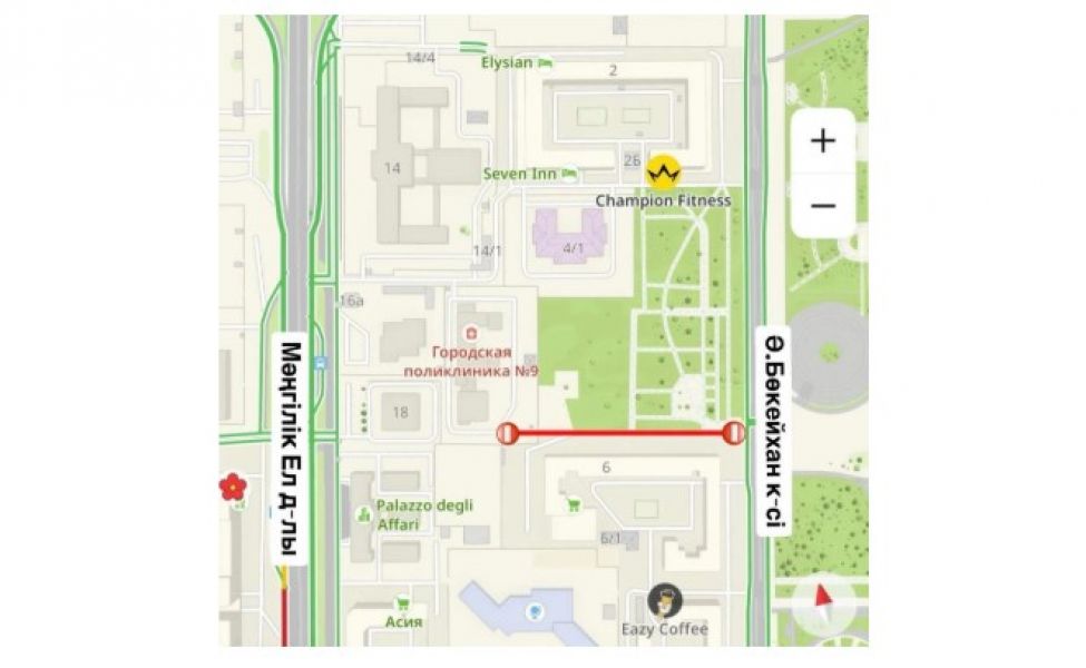 Проезд на вышеуказанном участке закрывают в связи с капитальным строительством улицы с сетями. Заезд к поликлинике будет осуществляться со стороны проспекта Мәңгілік Ел.