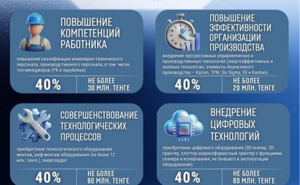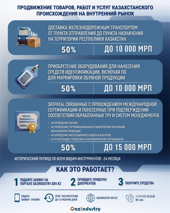 Отметим, оператором мер государственного стимулирования промышленности является АО «Казахстанский центр индустрии и экспорта «QazIndustry». Центр возмещает части затрат по двум направлениям: повышению производительности труда и продвижению продукции на внутренний рынок. Предприятия могут возместить до 40% своих затрат на приобретение технологического оборудования и внедрение цифровых технологий, повышение компетенций работников и эффективности организации производства, проведение сертификационных и лабораторных испытаний выпускаемой продукции, и так далее.