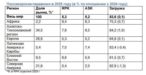 По итогам 2025 года международный пассажиропоток вырос на 7,1% по сравнению с 2024 годом, при этом провозные емкости увеличились на 6,8%. В декабре 2025 года международный спрос вырос на 7,7%, вместимость — на 7,9%, а коэффициент загрузки снизился на 0,1 п.п. по сравнению с декабрем 2024 года и составил 83,9%. Азиатско-Тихоокеанский регион завершил 2025 год с максимальными темпами роста и самым высоким уровнем загрузки по сравнению с другими регионами. Северная Америка продемонстрировала самые низкие темпы роста пассажиропотока и провозной емкости среди регионов в 2025 году, при этом самое значительное падение коэффициента загрузки среди регионов продемонстрировала Латинская Америка. Несмотря на то, что самый низкий коэффициент загрузки в 2025 году зафиксирован у африканских перевозчиков, для региона он стал рекордным и при этом показал самый высокий рост по сравнению с другими регионами.