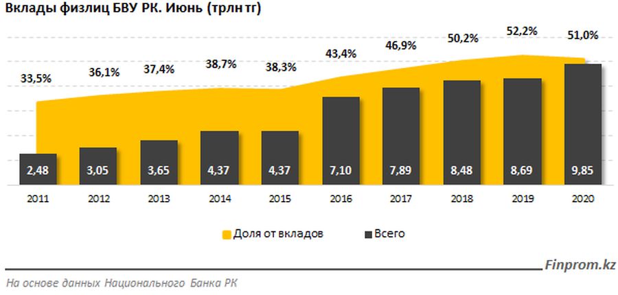 Розничные вклады в казахстанских банках к июлю текущего года достигли уже 9,85 трлн тг - сразу на 13,4% больше, чем годом ранее. Из 27 БВУ РК в плюсе 19 фининститутов, сообщает finprom.kz.