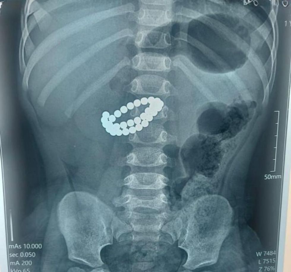 В приемное отделение в крайне тяжелом состоянии поступил малыш в возрасте 1 года 9 месяцев. После обследования врачи установили диагноз: инородные тела кишечника - 31 магнит, множественные перфорации тонкой кишки, диффузный каловый перитонит.