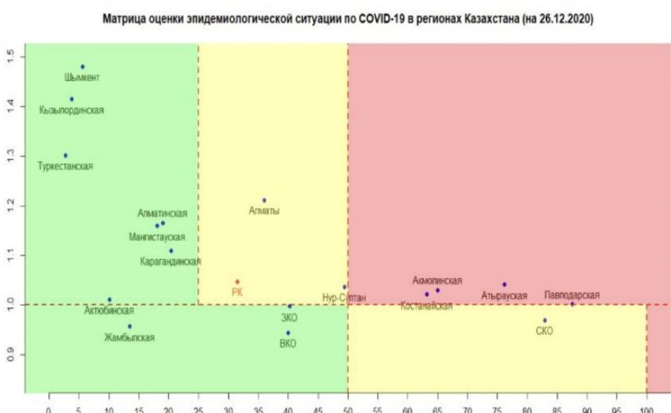 Согласно матрице оценки эпидемиологической ситуации в регионах Казахстана на 26 декабря, в "красной" зоне находятся четыре региона, передает Телеграм-канал МВК по нераспространению КВИ.⠀