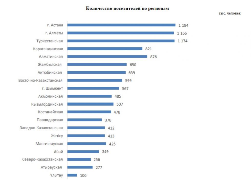 Наиболее посещаемыми стали город Астана (10,1%), Туркестанская область (10%), а также город Алматы (9,9%), Алматинская (7,4%) и Карагандинская области (7%).