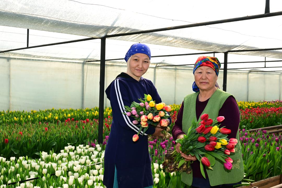 - Начиная с посадки, тюльпаны требуют постоянной заботы. Луковицы сначала охлаждаем, что активизирует их развитие. Готовим подходящую по составу почву для посадки. Затем постепенно поднимаем температуру. Высадку мы осуществляем в декабре, чтобы в феврале у нас были крепкие бутоны. Потом раз в 3-4 дня осуществляем полив через систему капельного орошения. Температура должна быть не менее +10 градусов. Ранним утром готовые цветы до раскрытия собираем, а потом эту работу продолжаем после 3 часов и до 7 вечера. В день собираем 5-7 тысяч цветов. Готовые букеты с луковицами упаковываем и отправляем в кладовую на хранение, в прохладу. Не менее важной частью все этой работы считаю человеческое тепло. С утра, когда захожу в теплицы, сначала здороваюсь с цветами, говорю им добрые слова. И у самой настроение поднимается, и цветы лучше растут, - считает Асылхан апа.