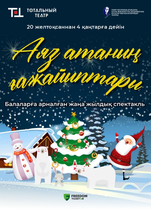 Билеттер ата-анаға және балаға жеке-жеке сатып алынады. 2 жасқа дейінгі балаларға тегін! (Туу туралы куәлік көрсетілген жағдайда) Балаларға арналған Жаңа жылдық ғажайып «Тотальный театрмен» бірге! «Тотальный театр» театр компаниясы мен Ғ. Мүсірепов атындағы балалар мен жасөспірімдер театры кішкентай көрерменді ерекше, мейірімді әрі сиқырлы қойылымға шақырады — «Аяз атаның ғажайыптары» Қойылым туралы. Тіпті Аяз атаның өзіне де кейде күмән келеді... Қазіргі балаларға ғажайып әлі керек пе, себебі олардың әлемі тым жылдам және ересек болып кетті ғой? Бірақ оның ғажайыптары болмаса, мереке өзінің сиқырын жоғалтады ғой! Кім шырша шамдарын жағады, кім барлығын би алаңына жинайды, кім сыйлықтар таратады және кім «Жаңа жылыңмен!» деп тілегін айтады? Бұл — достық, ғажайыптарға сену және бірге қуану туралы әсерлі, жарқын әрі музыкалық оқиға! Ал қойылымнан кейін — ертегі кейіпкерлерімен көңілді жаңа жылдық дискотека!
