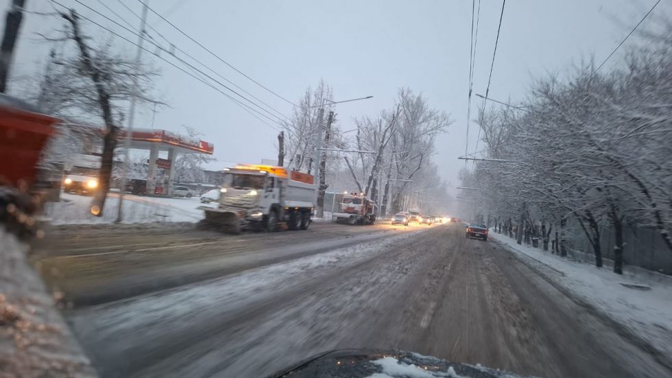 Ранним утром алматинцы по заснеженным дорогам добирались до работы.