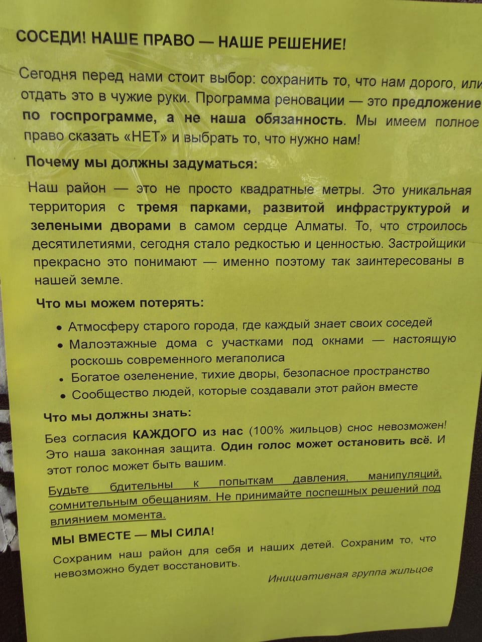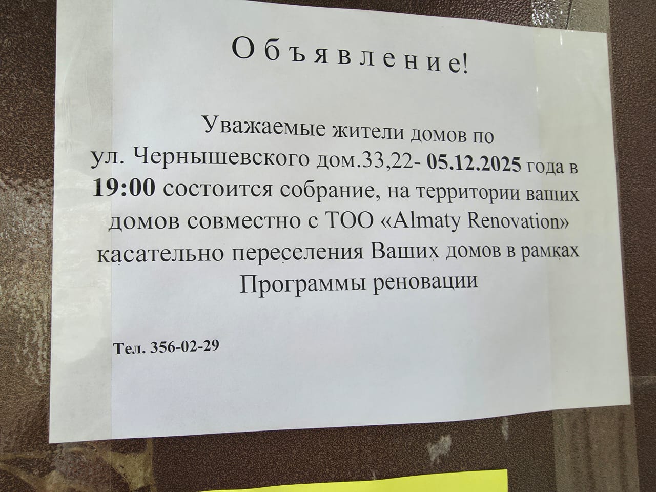 На собрании, устроенном организаторами переселения, стало известно, что никто не собирается давать взамен существующего жилья новое, а людей попросту переселяют в такие же старые квартиры, но на окраине Алматы.