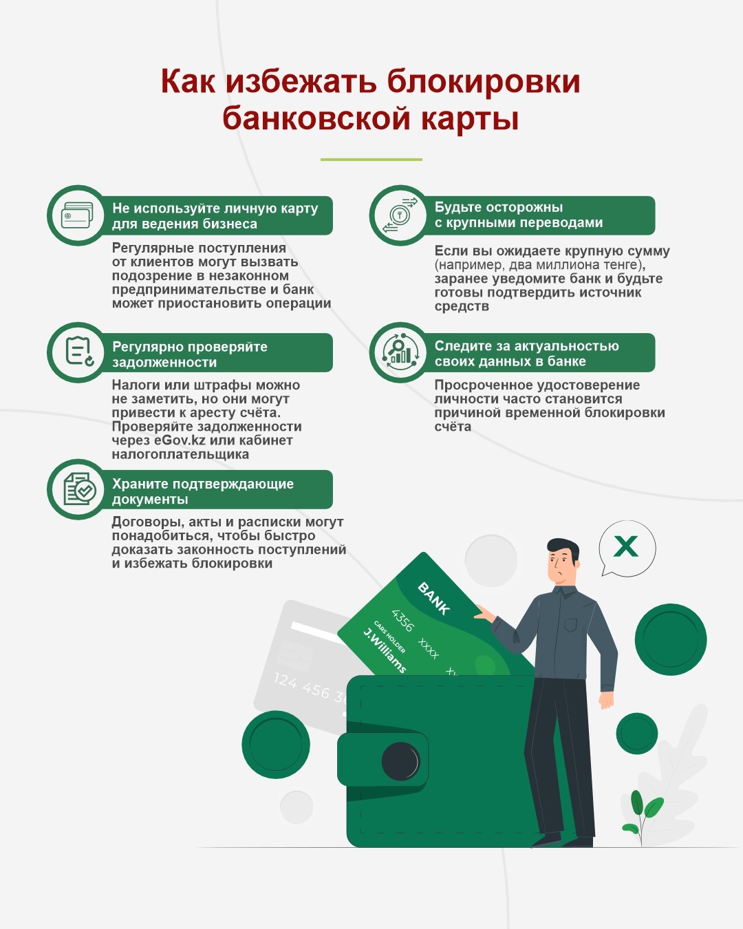 2. Подозрения в участии в схемах «дропперства». В Казахстане власти усиливают меры против схем, когда третьи лица используют чужие карты для обналичивания украденных средств - так называемые money mule или «обменщики» (dropper‑схемы). За передачу доступа к счету или карте третьим лицам может наступить уголовная ответственность, а банк может заблокировать все счета, связанные с подозрительной активностью.