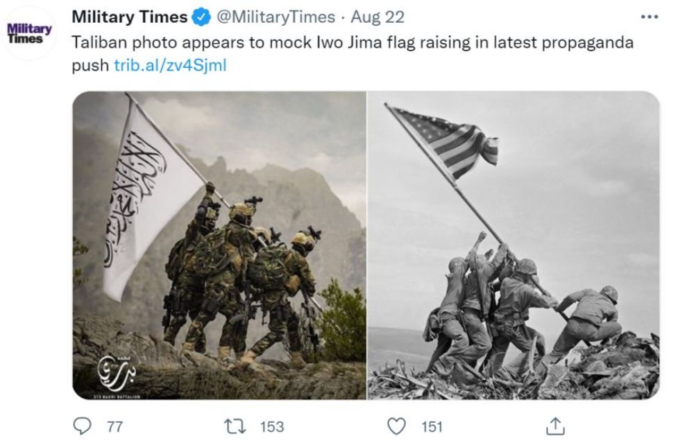 На прошлой неделе в соцсетях распространилась фотография отряда талибов специального назначения “Бадри 313”, в которой многие СМИ увидели пародию на знаменитый кадр поднятия флага США над Иводзимой в 1945 году.
