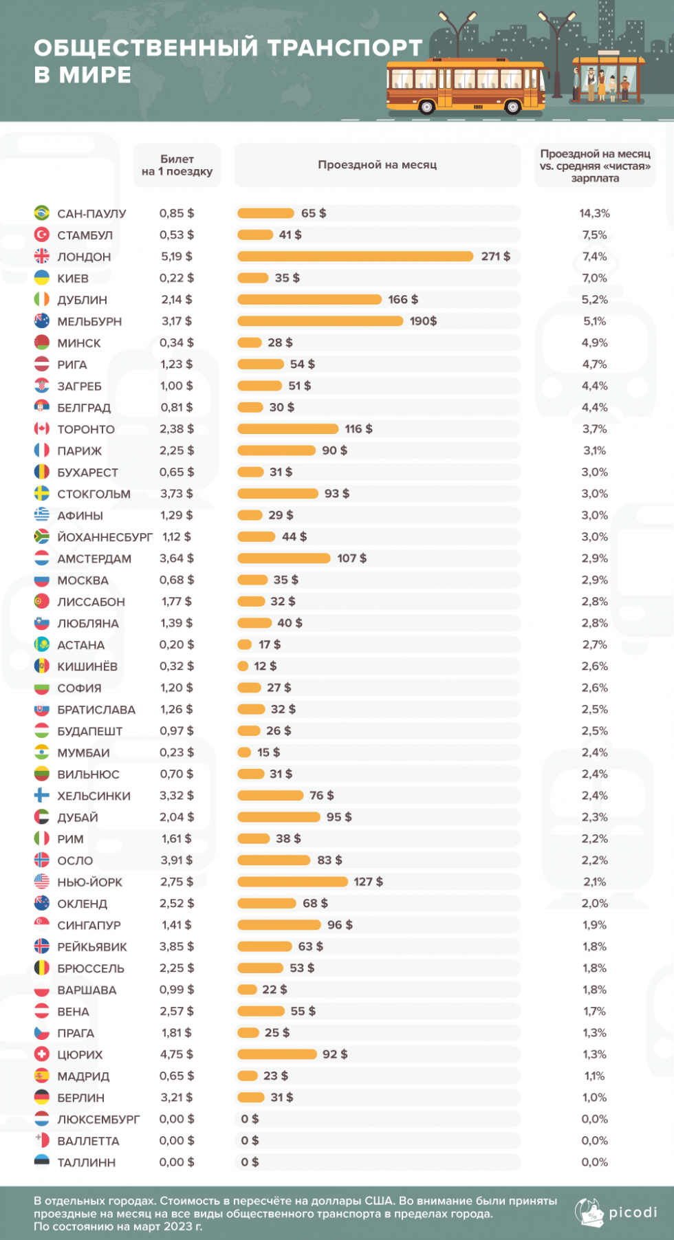Команда Picodi.com изучила стоимость билетов на общественный транспорт в 45 крупных городах мира и сопоставила эти расходы с заработной платой.