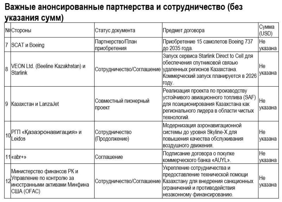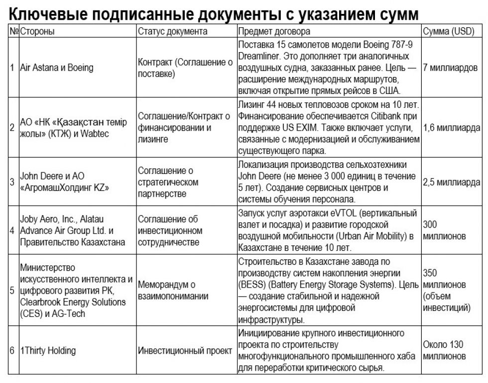 – Ее можно разделить на три главных трека. Первый, и самый большой, если исходить из объема финансирования по соглашениям, это договоренности о поставке 15 бортов Boeing 787 для Air Astana за $7 млрд. Из общего заявленного объема по всем соглашениям в $17 млрд это самый большой контракт. Пассажирские самолеты позволят флагманской авиакомпании страны обновить и расширить флот дальнемагистральных судов, а также существенно увеличить количество направлений с высокой дальностью, в том числе и в Соединенные Штаты. Еще 15 бортов Boeing 737 MAX в перспективе до 2035 планирует приобрести Scat.