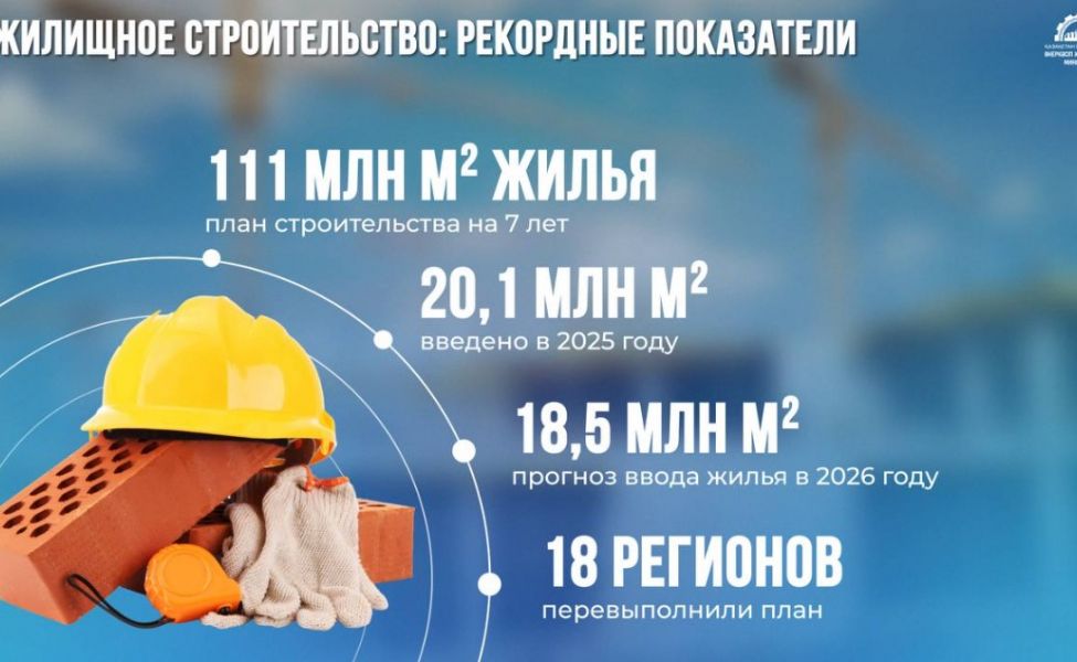 Так, по итогам 2025 года введено рекордное количество жилья. При плановом показателе 19,2 млн кв. метров введено в эксплуатацию 20,1 млн кв. метров, превысив показатель предыдущего года. В целом плановый показатель перевыполнен в 18 регионах страны.