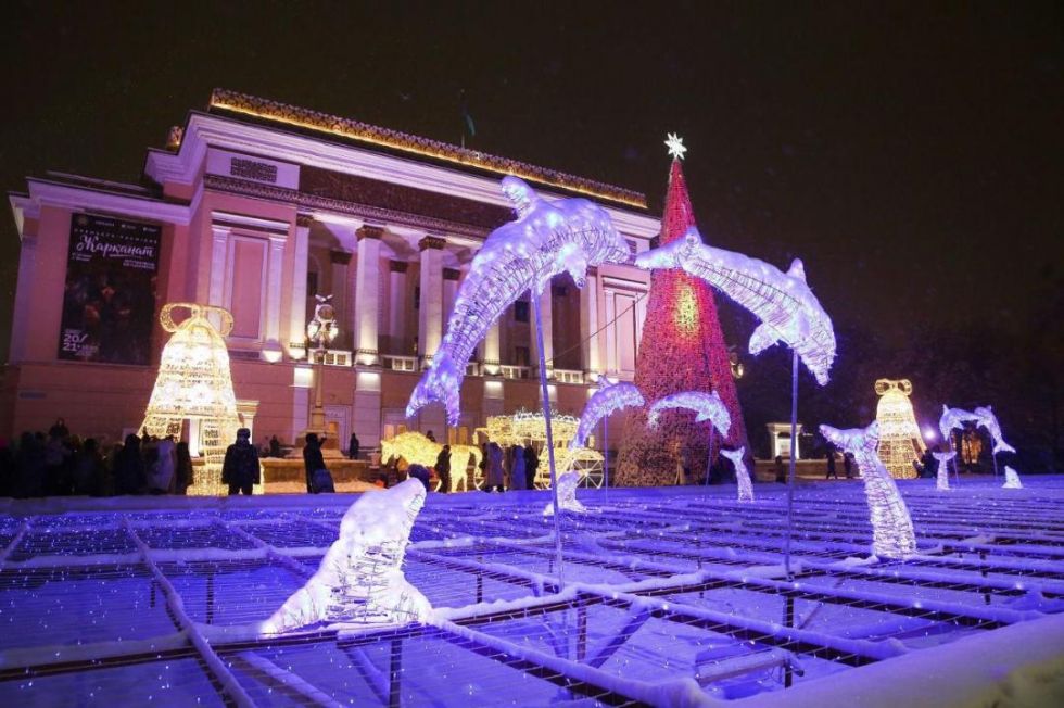 Особое внимание уделено художественному наполнению городского пространства. По всему Алматы размещены световые фигуры сказочных персонажей, арт-объекты с символикой 2026 года, декоративные композиции в форме снежинок, подарков, оленей и новогодних шаров. Установленные инсталляции стали популярными фотозонами для жителей и туристов.