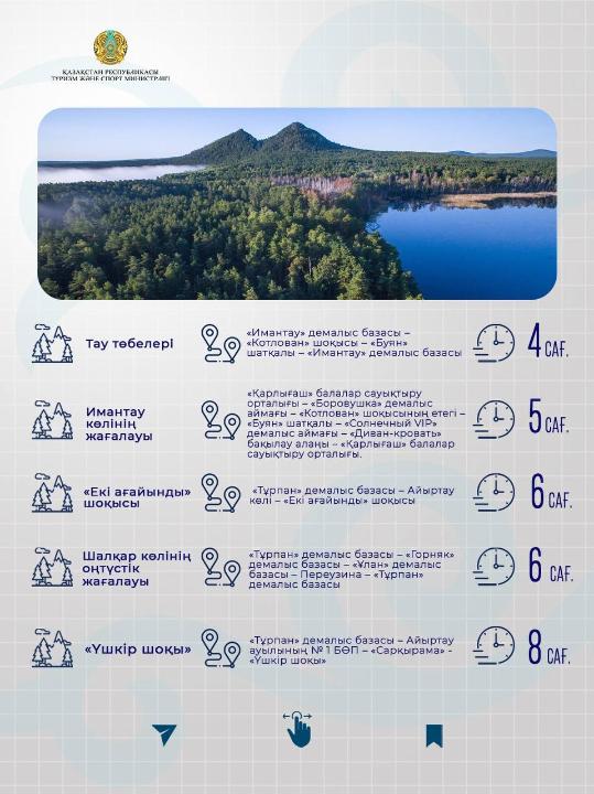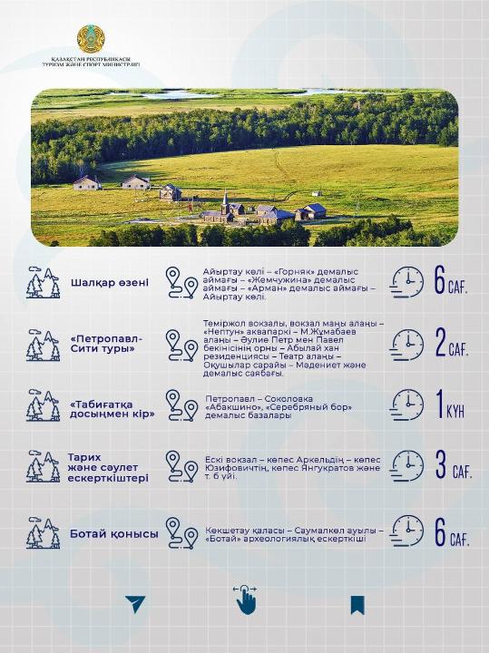 Маршруты проходят по живописным территориям Айыртауского района, вдоль побережья озёр Имантау и Шалкар, через ущелье Буян и горные сопки, а также включают прогулки по историческим и культурным объектам Петропавловска.