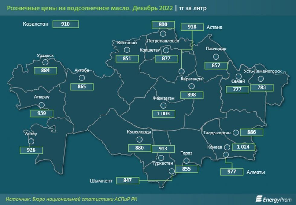 Средняя розничная цена на подсолнечное масло в декабре 2022 года составила 910 тг за литр.
