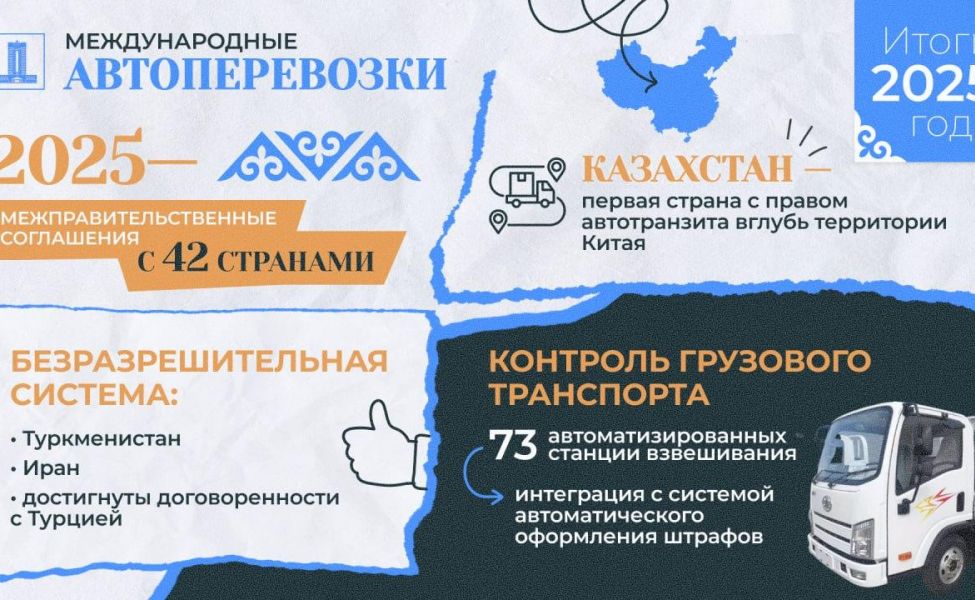 В 2025 году Казахстан расширил географию международных автомобильных перевозок, заключив межправительственные соглашения с 42 странами. Внедрена безразрешительная система перевозок с Туркменистаном, Ираном и достигнуты договоренности с Турцией.
