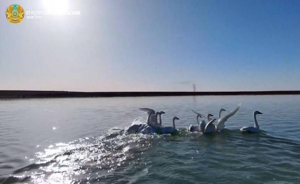 Стаю лебедей засняли работники Кызылординского филиала РПГ «Казводхоз» во время мониторинга водохранилища «Бесарык». Появление птиц связано с увеличением объема воды на объекте.