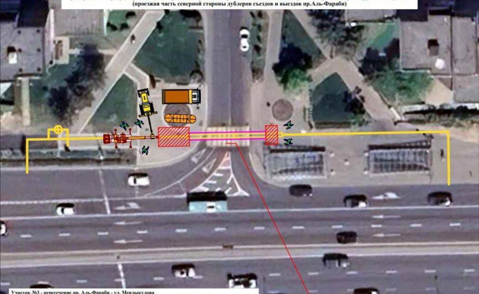 Работы будут проводиться в районе пересечения пр. аль-Фараби и ул. Мендыкулова. Проект предусматривает устройство перехода под улицей с выполнением прокола и последующей укладкой трубопровода.
