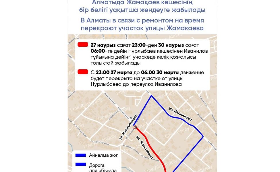 Напомним, вся информация касательно ограничения движений размещена в Telegram-канале @AlmatyJoly, в социальных сетях акимата, а также в сервисах 2GIS и «Яндекс карты».