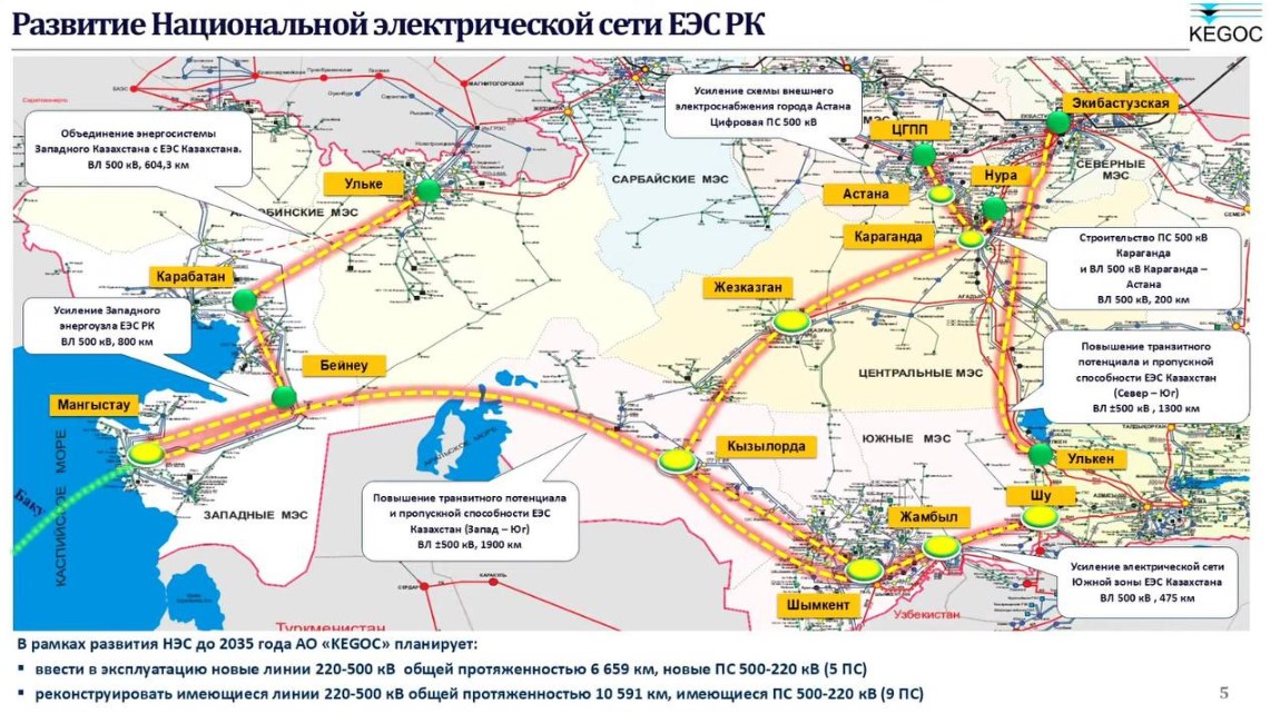 В целях усиления электрической сети Южной зоны ЕЭС Казахстана реализуется проект по увеличению пропускной способности транзита «Север–Юг» на участке «Алматы – Жамбыл» на 440 МВт. Это создаст условия для интеграции в энергосистему новых газовых электростанций и объектов ВИЭ. В рамках проекта будет построено две линии 500 кВ протяженностью 475 км. Ввод объекта запланирован на июнь 2027 года.