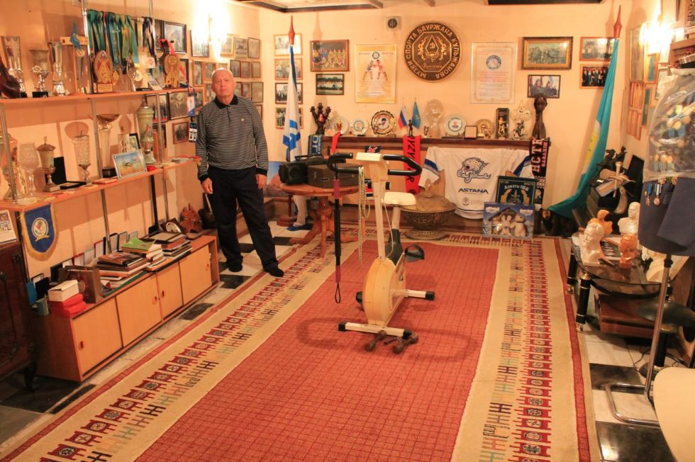 В подвале дома Бауржана Кульжанова создан настоящий музей. Медали, старые награды, фотографии с великими спортсменами и артистами, цирковая штанга из бывшего петропавловского цирка.