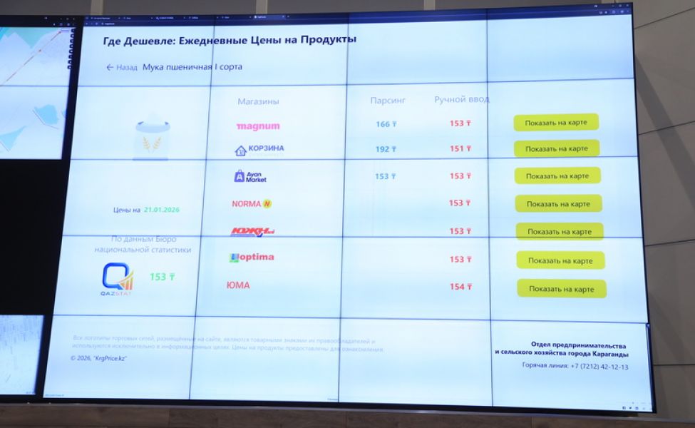 Один из проектов направлен на мониторинг цен на социально значимые продукты. Система в режиме реального времени собирает данные с сайтов торговых сетей «Магнум», «Корзина» и «Аян», а также дополняется информацией, вручную собранной в других магазинах.