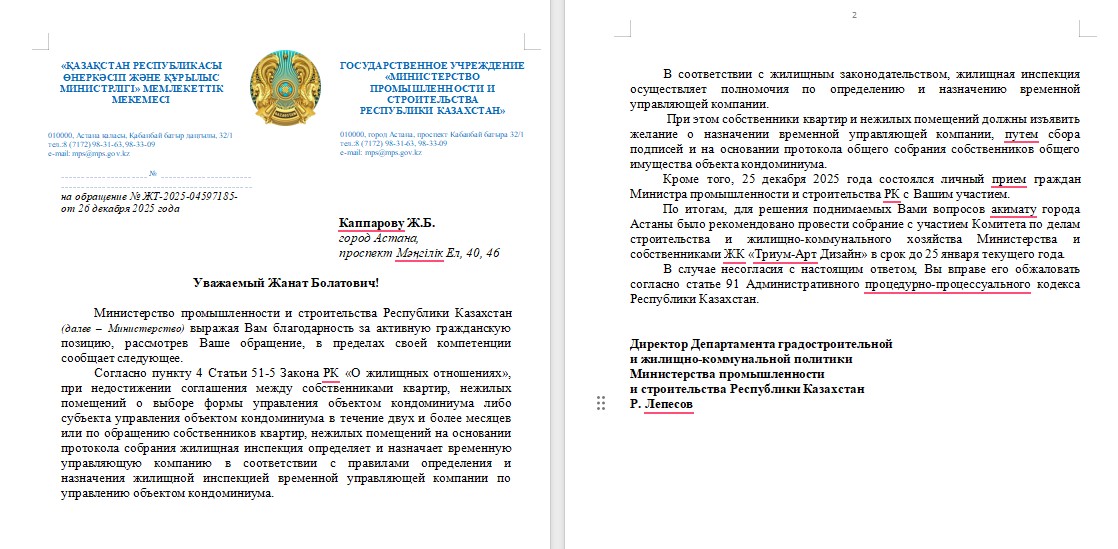 В декабре прошлого года Нагаспаев, после личного приёма Каппарова, вновь поручил акимату Астаны в срок до 25 января 2026 года провести собрание всех собственников ЖК «Триумф-Арт Дизайн» с участием Комитета по делам строительства и жилищно-коммунального хозяйства.